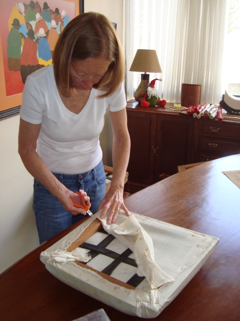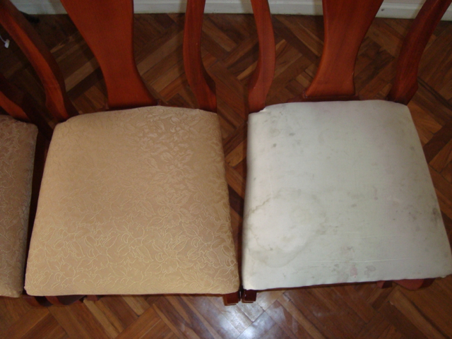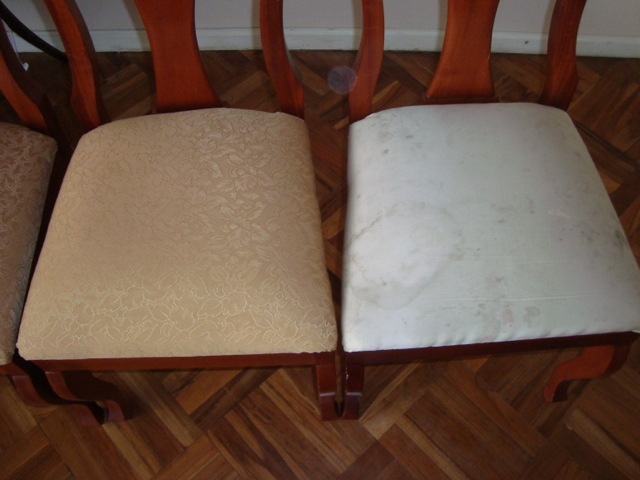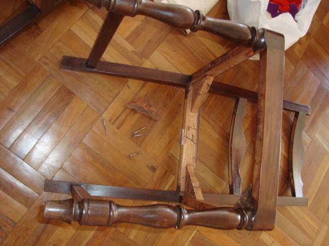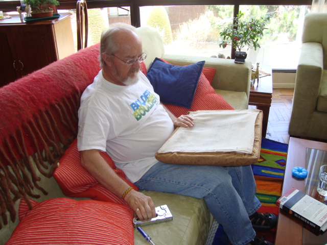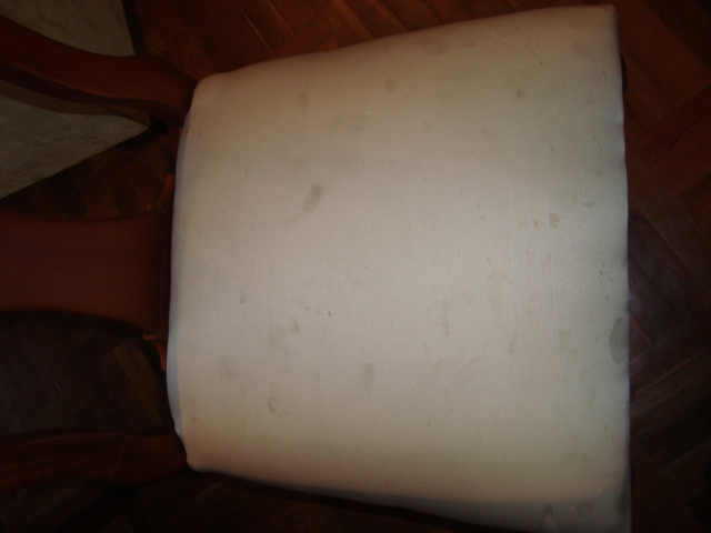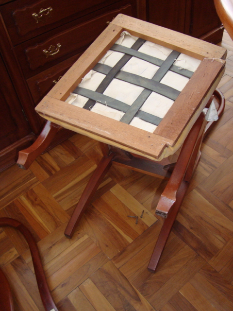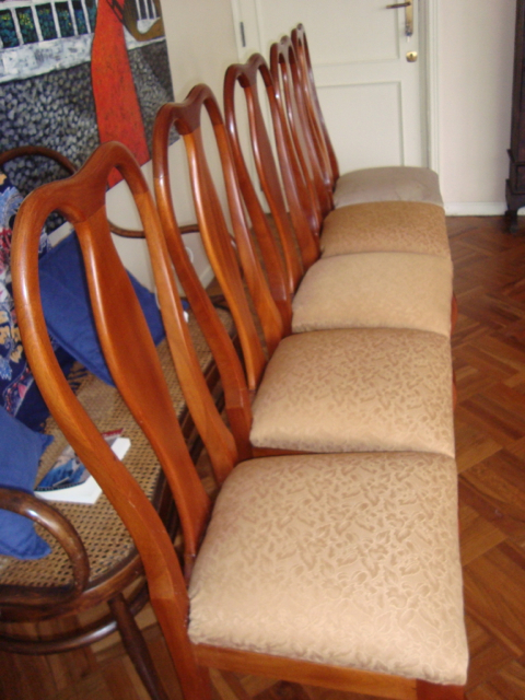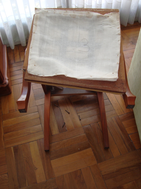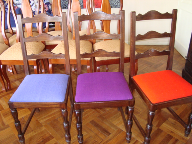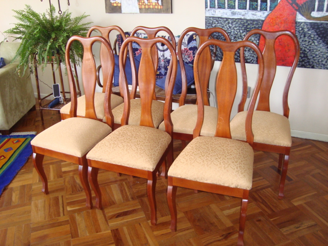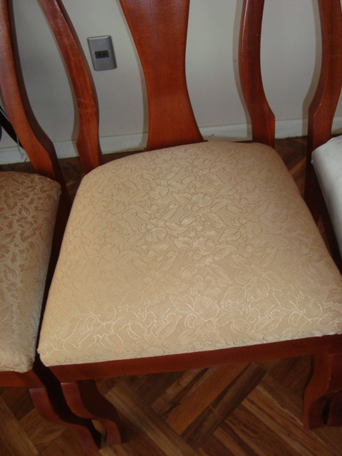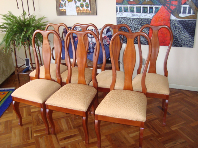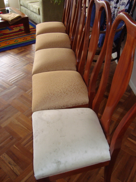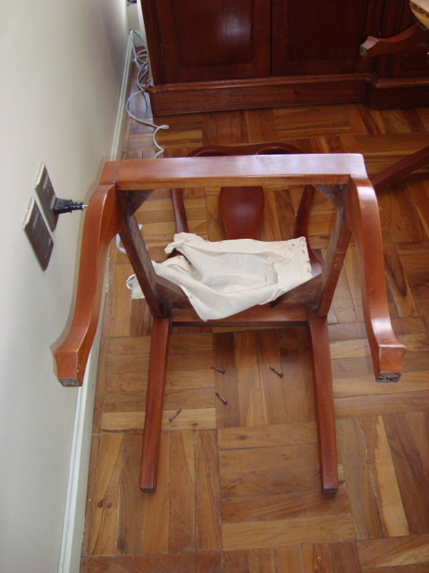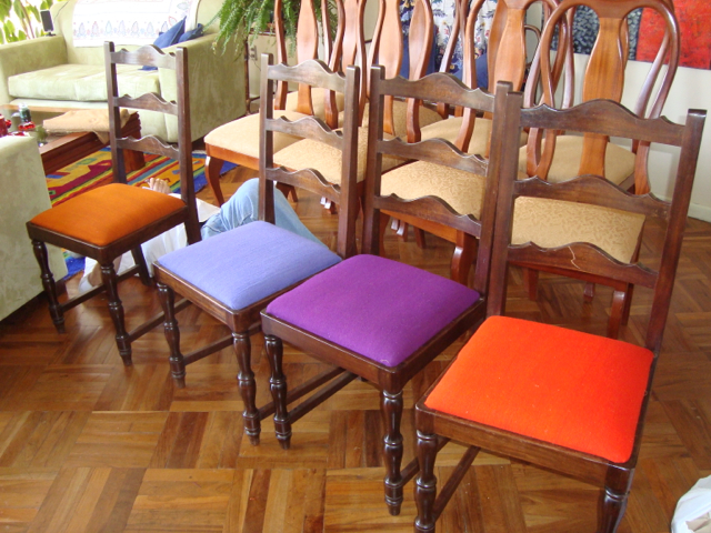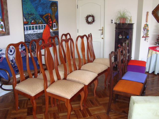 We’re finished! We did it! Our weekend project only took two days to recover 8 dining room chairs and 4 breakfast table chairs. Our school would not assist us with a recovering project, so . . . as we had already decided we could never sit on ANY of the dining room chairs (we’ve been here over a month), we needed to take on this project. On Friday I went with a group to the fabric district way uptown by taxi (50 Bolivianos–we paid way too much!). I found fabric for our dining room chairs and then we proceeded on down the hill to the Calle Sarganaga just off the Witches’ Market to purchase some rugs to brighten our apartment space. The chair coverings are beautiful now; however, the seat coverings surely were disgusting while taking off the old. How the school expected us to use these chairs was beyond our imagination–we didn’t. Now we’re happy and will be ready for company on Christmas Eve! 🙂